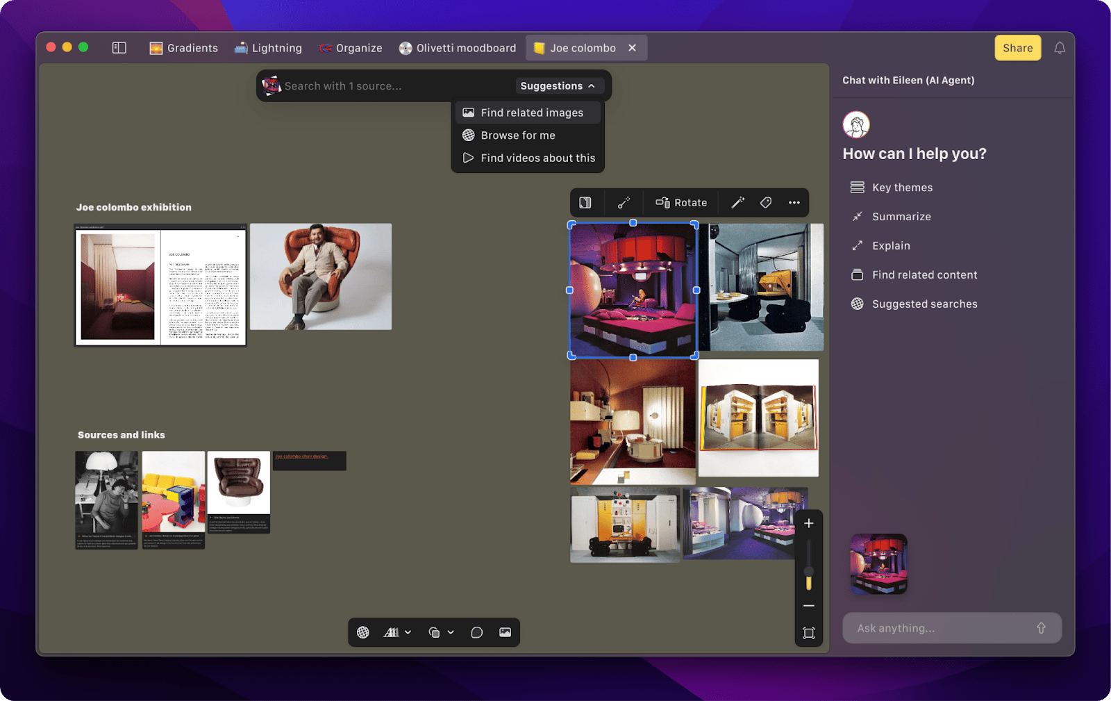 Kosmik can find assets for your moodboard from the web with the help of AI. Just type a few words and assets appear right in your workspace, saving you hours of work. Kosmik automatically categorizes and tags everything you save. It recognizes objects, subjects, and even colors from your moodboard assets.