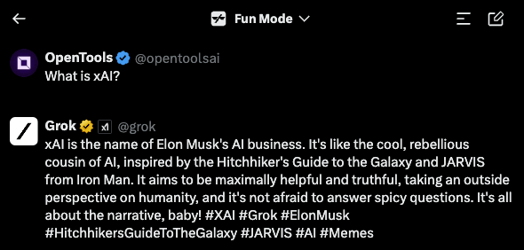 Here’s how Grok describes it’s parent, xAI. Notably, it mentions its focus on being “maximally helpful and truthful”.